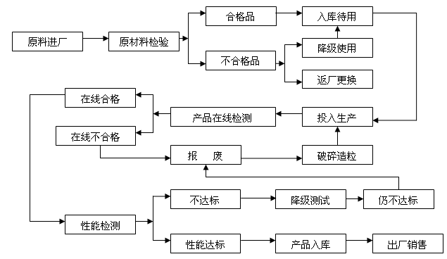 3 在生產(chǎn)過程中,嚴(yán)格按照相關(guān)標(biāo)準(zhǔn)對產(chǎn)品質(zhì)量進(jìn)行跟蹤檢驗。檢驗形式由生產(chǎn)班組自檢和品質(zhì)保證部專人檢驗相結(jié)合。其主要檢驗項目有,產(chǎn)品表觀性能,結(jié)構(gòu)尺寸(壁厚,長度)檢驗。對檢驗合格的表觀成品直接進(jìn)入產(chǎn)品性能檢測流程。對表觀及結(jié)構(gòu)尺寸不符合要求的產(chǎn)品直接報廢。